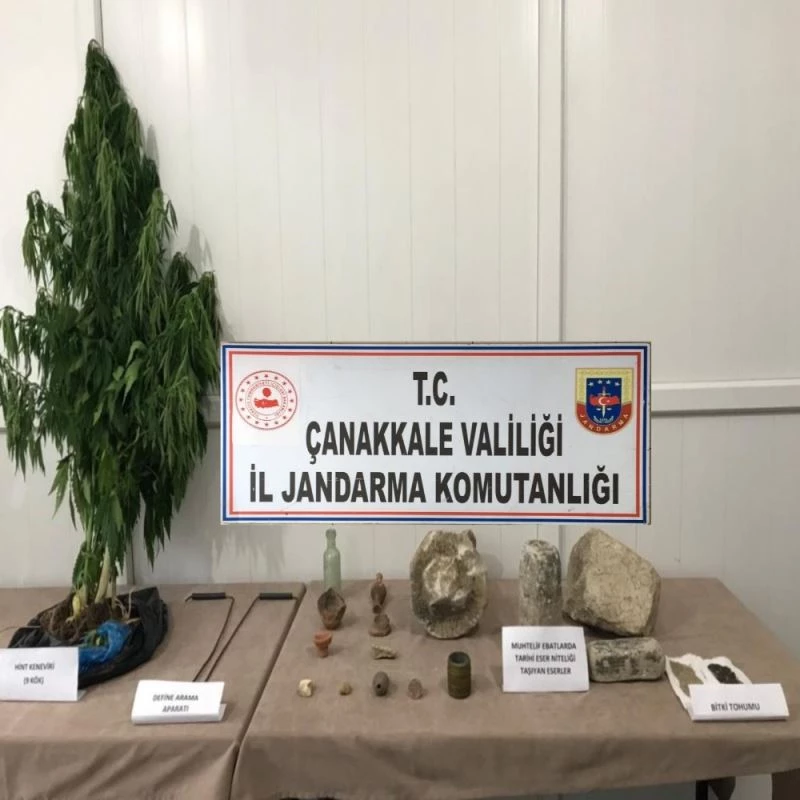 Olay yerinde ele geçirilen 1 kepçe ve 1 metal define arama aparatı ile şüpheli şahısların; ev ve araçlarında yapılan aramalar sonucunda; 9 adet hint keneviri bitkisi, 1 adet eski döneme ait 15x3 cm ebatında gözyaşı şişesi, 1 adet eski döneme ait 9x2 cm çapında kırık gözyaşı şişesi, 2 adet eski döneme ait yüz figürü olan 4x3 cm, 3x2 cm taş parçası, 1 adet 3 cm çapında üzerinde Osmanlı tuğrası figürü bulunan sikke, 1 adet 17x5 cm çapında eski döneme ait cam şişe, 4 adet eski döneme ait kırık gözyaşı şişesi dip kısmı, 1 adet 7x4 çapında metal tarihi eser, 1 adet 24x9 ebatında mezar taşı, 1 adet 18x6 cm tarihi eser niteliğinde taş parçası, 1 adet 20x19 geometrik şekli olan üzerinde yazı bulunan taş parçası, 1 adet 37x12 cm ebadında tarihi eser niteliğinde taş parçası, 9,21 gram siyah bitki tohumu ve