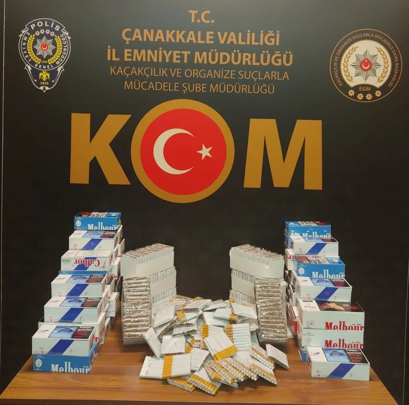 Çanakkale İl Emniyet Müdürlüğü Kaçakçılık ve Organize Suçlarla Mücadele (KOM) Şube Müdürlüğü ekipleri tarafından kaçakçılıkla mücadele çerçevesinde bir şahsın iş yerine operasyon yapıldı. Ekipler işyerinde yaptıkları aramada, 52 kutuda toplamda 10400 dal doldurma sigara ve 209 şeffaf poşette 4180 dal doldurma sigara ele geçirildi. Şüpheli O.G. isimli şahıs hakkında 5607 SKM suçundan adli işlem yapıldıktan sonra savcılık talimatıyla serbest bırakıldı.