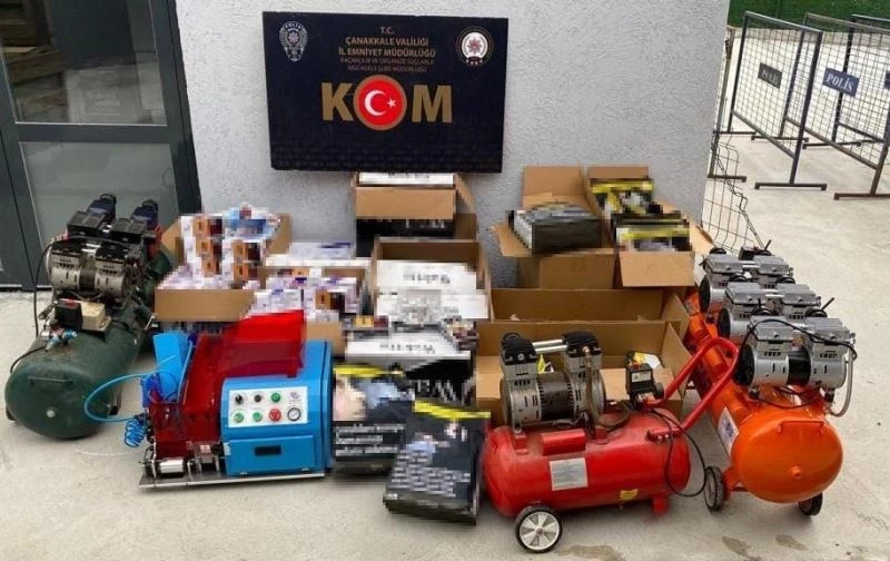 Çanakkale İl Emniyet Müdürlüğü Kaçakçılık ve Organize Suçlarla Mücadele (KOM) Şube Müdürlüğüne bağlı Kaçakçılık Suçları Büro Amirliği ekipleri, kaçakçılıkla mücadele çerçevesinde 5607 SKM suçundan, R.Ö, M.K, A.B ve Z.K isimli şahısların depo ve aracında yapılan adli aramalarda 1 adet sigara sarma makinesi, 3 adet hava kompresörü, 35 bin adet doldurulmuş sigara, 59 bin 400 adet boş makaron, 21 kilogram ( 21 paket ) bandrollü tütün, 41 adet mükerrer kullanılmak üzere kesilmiş bandrol ele geçirildi.