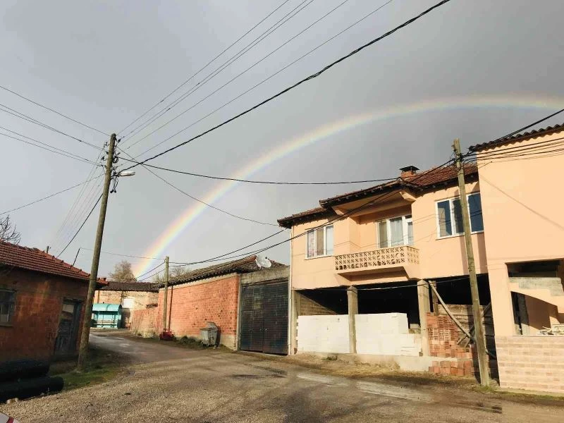 Çanakkale’nin Çan ilçesine bağlı Küçükpaşa köyünde sağanak yağmurun ardından gökyüzünde oluşan gökkuşağı manzarası muhteşem görüntüler oluşturdu.