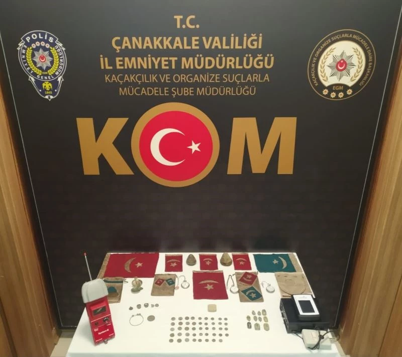 Çanakkale İl Emniyet Müdürlüğü Kaçakçılık ve Organize Suçlarla Mücadele Şube Müdürlüğü tarafından yapılan operasyonda, şüpheli M.G.’nin ikametinde yapılan aramalarda 62 tarihi eser olduğu değerlendirilen taş obje, 6 Osmanlı döneminden kalma el yapımı kırmızı beyaz ve yeşil beyaz renklerinde ay yıldızlı bayrak, 4 köstekli saat, üzerinde ‘Ottoman’ ibaresi ve Arapça ifadeler bulunan 7 bez torba, 2 top mermisi başlığı, 2 alan tarama dedektörü ile bu dedektöre ait 4 kablo ile ekipmanlar ele geçirildi. Gözaltına alınan M.G., savcılık talimatıyla serbest bırakıldı.
