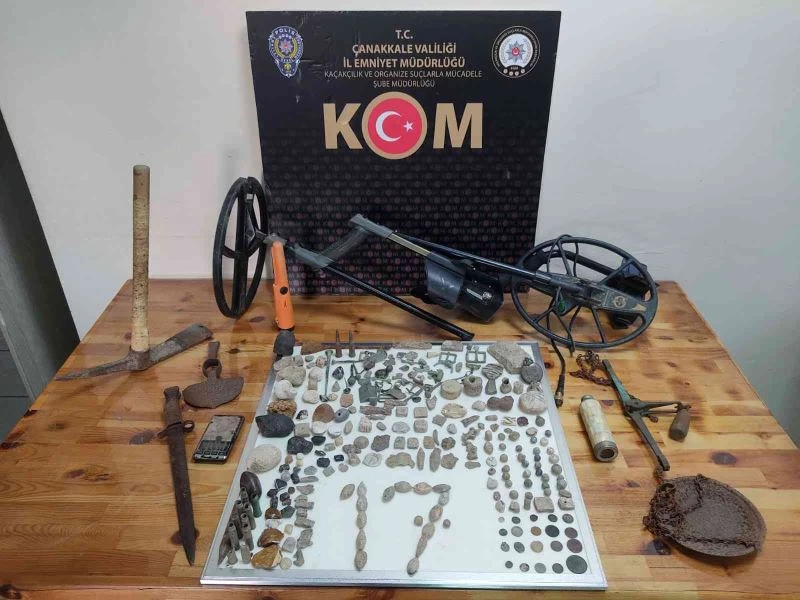 Çanakkale İl Emniyet Müdürlüğü KOM Şube Müdürlüğü ekipleri tarafından tarihi eser kaçakçılığının önlenmesine yönelik yapılan aramada, 1 adet metal (kazma kürek), 1 adet metal süngü, 1 adet el kantarı, 1 adet dürbün, 121 adet kurşun materyal, 63 adet metal obje, 58 adet taş obje, 13 adet mermi ve kovan, 19 adet sikke, 1 adet köstekli saat, 1 adet kazma, 1 adet hassas terazi, 2 adet metal dedektör ve ekipmanları ele geçirildi.