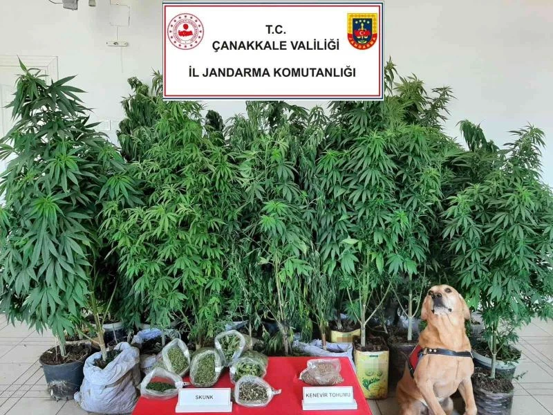 Çanakkale İl Jandarma Komutanlığına bağlı ekipler tarafından son bir hafta içerisinde uyuşturucuya yönelik yapılan operasyonlarda, 1 kilo 110 gram skunk maddesi, 210 gram kubar esrar, 234 kök kenevir bitkisi, 43 kök skunk bitkisi, 475 skunk tohumu, 1 adet 9 milimetre ruhsatsız tabanca ve şarjörü, 128 adet 9 milimetre tabanca fişeği, 4 adet yivsiz av tüfeği, 38 adet av fişeği, 1 adet hassas terazi, 1 adet ilaç pompası, 5 kilogram gübre ve muhtelif bakım malzemeleri ele geçirildi. 7 şüpheli şahıs hakkında ise adli işlem başlatıldı.