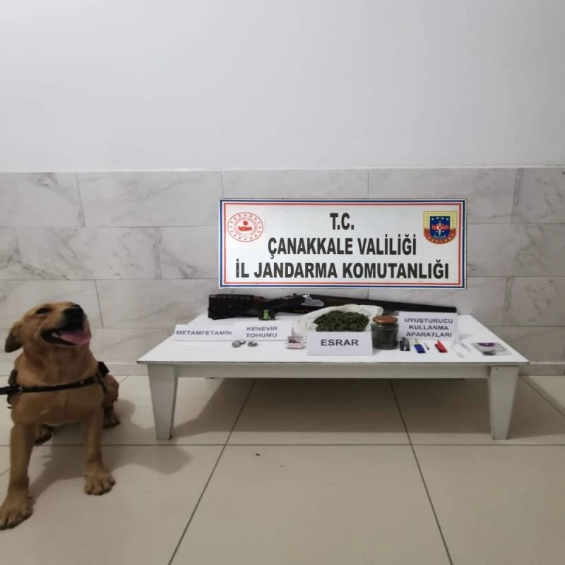 Çanakkale İl Jandarma Komutanlığı ekipleri, merkez ilçede uyuşturucu madde satışı yapan ve kullanan şahıslara yönelik sürdürdükleri çalışmalar neticesinde şüpheli bir şahsın ev ve iş yerine operasyon düzenledi. Yapılan operasyonda; 534 gr. esrar maddesi, 131 gr. kenevir tohumu, 5 gr. metamfetamin, 4 gr. paketlenmiş satışa hazır esrar maddesi, 3 adet uyuşturucu madde kullanma aparatı, 1 adet Süperpoze yivsiz av tüfeği, 9 adet dolu yivsiz av tüfeği fişeği ele geçirildi.