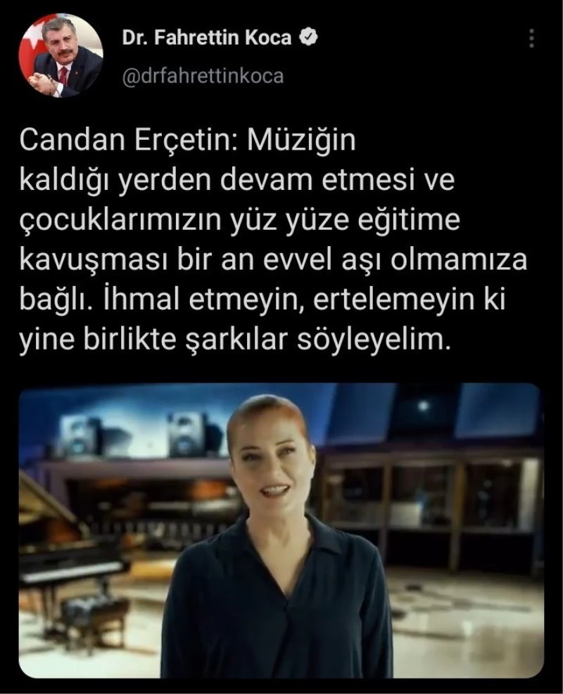 Sağlık Bakanlığınca Covid-19 ile mücadele kapsamında başlatılan aşılama programına ünlülerden de destek sürüyor. Yayınlanan video ile görüşlerini belirten sanatçı Candan Erçetin, "Müziğin kaldığı yerden devam etmesi ve çocuklarımızın yüz yüze eğitime kavuşması bir an evvel aşı olmamıza bağlı" dedi.