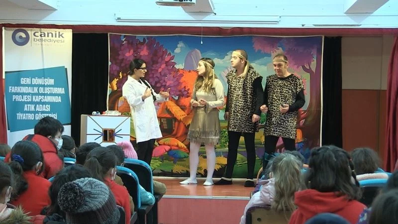 Kültür ve sanat faaliyetlerine hız kesmeden devam eden Canik Belediyesi, yürüttüğü çevre projesi kapsamında ilçedeki ilkokullarda sergilenen tiyatro oyunları ile öğrencilere çevre bilinci kazandırıyor.
