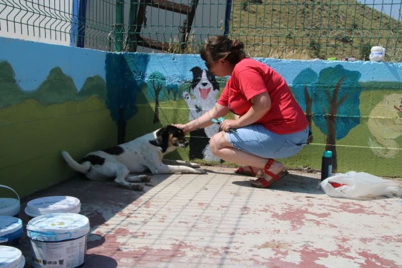 Çankaya Belediyesi Sahipsiz Sokak Hayvanları Bakım ve Rehabilitasyon Merkezinin duvarları, Ressam Başak Gözde tarafından renklendiriliyor.