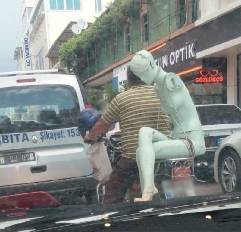 Osmaniye’nin Kadirli ilçesinde bir motosikletlinin cansız mankenle birlikte ana cadde üzerindeki seyahati görenleri şaşırttı.