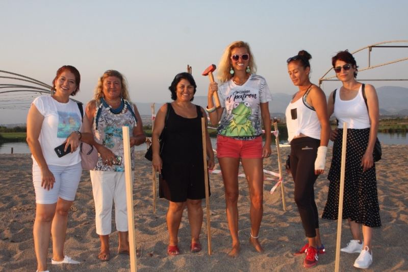 Caretta kaplumbağaları konusundaki duyarlılığı nedeniyle Kaplumbağa kadın olarak adlandırılan Seher Ulaş ve Manavgatlı çevreci kadınların misafiri olarak Boğaz mevki’ine gelen ünlü sanatçı Tuğba Özay, Boğaz mevki’indeki 212. Caretta yuvasının çıtalarını çaktı.
