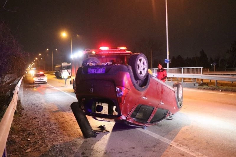 Sakarya D-100 Karayolu’nda tıra çarpan araç, kontrolden çıkarak takla attı. Yaklaşık 200 metre sürüklenen araç sürücüsü, olay sonrasında yardımına gelen tır şoförüne küfür ederek olay yerinden kaçtı.