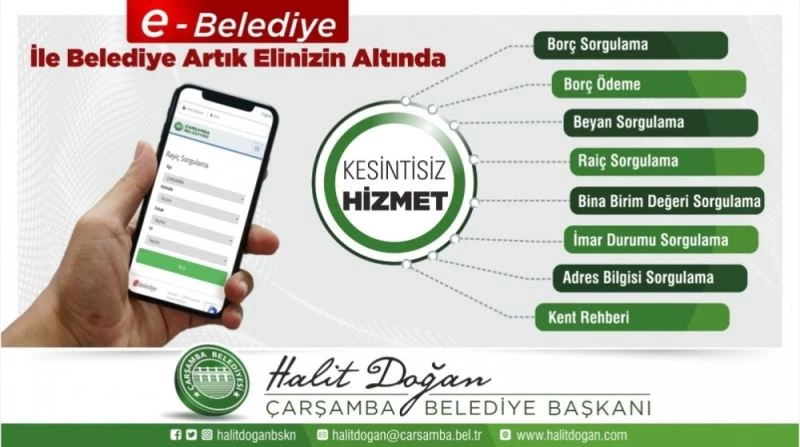 Sistemde borç sorgulama ve ödeme haricinde beyan sorgulama, rayiç bedeli sorgulama, bina birim değeri sorgulama, imar durumu sorgulama ve adres bilgi sorgulama gibi işlemlerde yapılacak. Çarşamba Belediye Başkanı Halit Doğan, “Teknolojinin hızla geliştiği günümüzde güçlü teknolojik alt yapısı ile vatandaşların günlük yaşantısını kolaylaştıran bir belediyecilik anlayışı ile e-belediye projemizi hayata geçirdik. Çarşamba halkı bilgi edinme ve her türlü işlemlerini artık internet üzerinden yapabilecek. E-belediyecilik sistemimizdeki hizmetleri geliştirerek çalışmalarımıza devam edeceğiz. E-belediye hizmeti ile hemşehrilerimiz dünyanın dört bir köşesinden borçlarını sorgulayabilecek ve ödemelerini Çarşamba Belediyesine resmi internet sitesi ’www.carsamba.bel.tr’ üzerinden 7/24 gerçekleştirebilecekler" dedi.