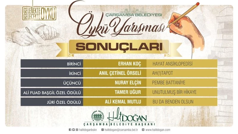 Çarşamba Belediyesi tarafından, “Gelenekte Öykü Gelecekte Öykü” sloganı ile 14 Şubat Dünya Öykü Günü’nde başlatılan ve Türkiye’nin dört bir tarafından 600’den fazla eserin katıldığı ‘Çarşamba Belediyesi Öykü Yarışması’nın sonuçları açıklandı. Çarşamba Belediyesi sosyal medya hesaplarından duyurulan yarışmanın birincisi “Hayat Ansiklopedisi” isimli öyküsüyle Erhan Koç, ikincisi “Ah(!)tapot” adlı öyküsüyle Anıl Çetinel Örseli, üçüncüsü “Pembe Battaniye” adlı öyküsüyle Nuray Elçin, dördüncüsü “Unutulmuş Bir Hikâye” adlı öyküsüyle Tamer Uğur, beşincisi ise “Bu da Benden Olsun” isimli öyküsüyle Ali Kemal Mutlu oldu.