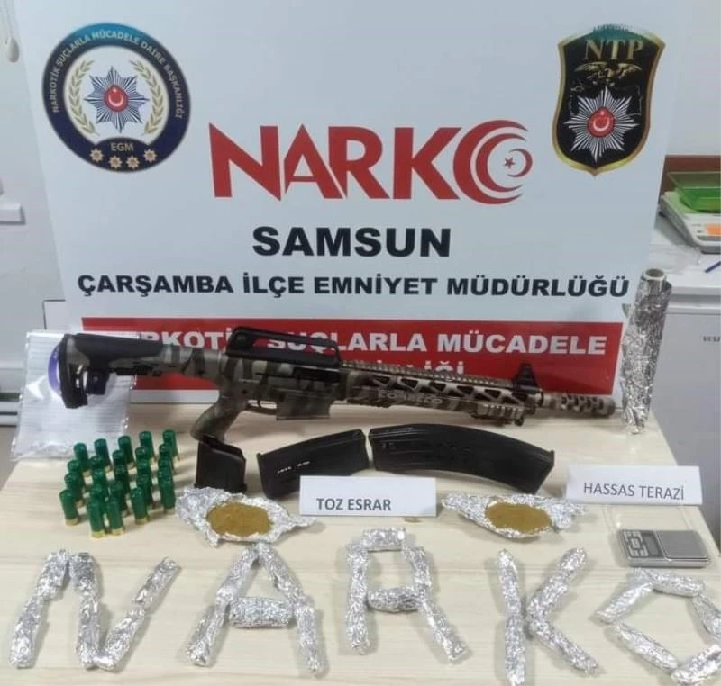 Edinilen bilgiye göre, Çarşamba Narkotik Suçlarla Mücadele Grup Amirliği ekiplerince alınan istihbari bilgiler neticesinde, ilçe merkezinde H.Y. (35) isimli şahsın ikametinde ve üst aramasında yapılan kontrollerde 30 parça halinde 403,23 gram toz esrar maddesi, 1 adet otomatik av tüfeği, 24 adet tüfek kartuşu ve 1 adet hassas terazi ele geçirildi. Olayla ilgili H.Y. yakalanarak gözaltına alındı.