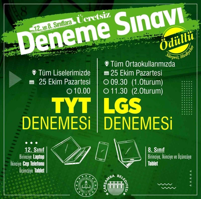 Çarşamba Belediyesi tarafından TYT denemesi birincisine laptop, ikincisine cep telefonu, üçüncüsüne tablet; LGS denemesi birincisi, ikincisi ve üçüncüsüne ise tablet hediye edilecek. Deneme sınavlarında başarılı olan öğrencileri ise sürpriz hediyeler bekliyor.