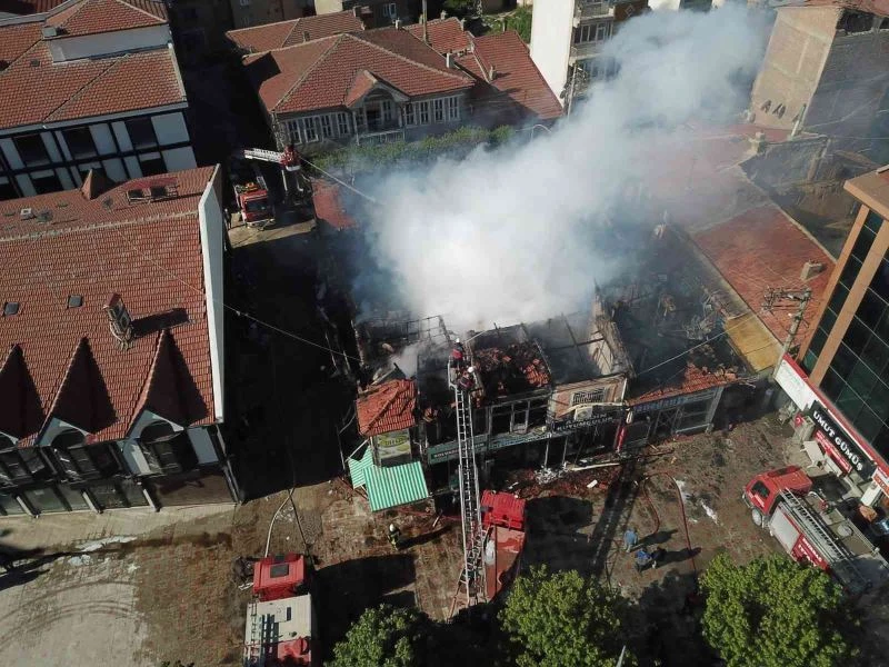 Afyonkarahisar’ın Bolvadin ilçe merkezinde çıkan ve 15 iş yerinin yandığı, 5’inin de kısmi zarar gördüğü çarşı yangında dron ile havadan çekilen görüntü yaşanan faciayı gözler önüne sererken, çevre esnafının iş yerlerinden eşyalarını kurtarmasına polis ile bekçiler yardım etti.