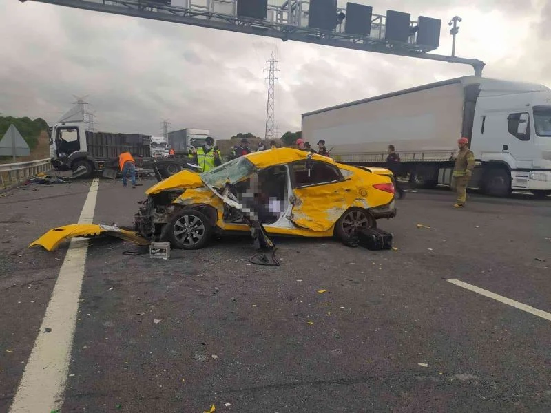 Kuzey Marmara Otoyolu Çatalca Gişeleri mevki’inde sürücüsünün direksiyon hakimiyetini kaybettiği ticari taksi ile tır kafa kafaya çarpıştı. Kaza da ticari taksi şoförü olay yerinde hayatını kaybetti.