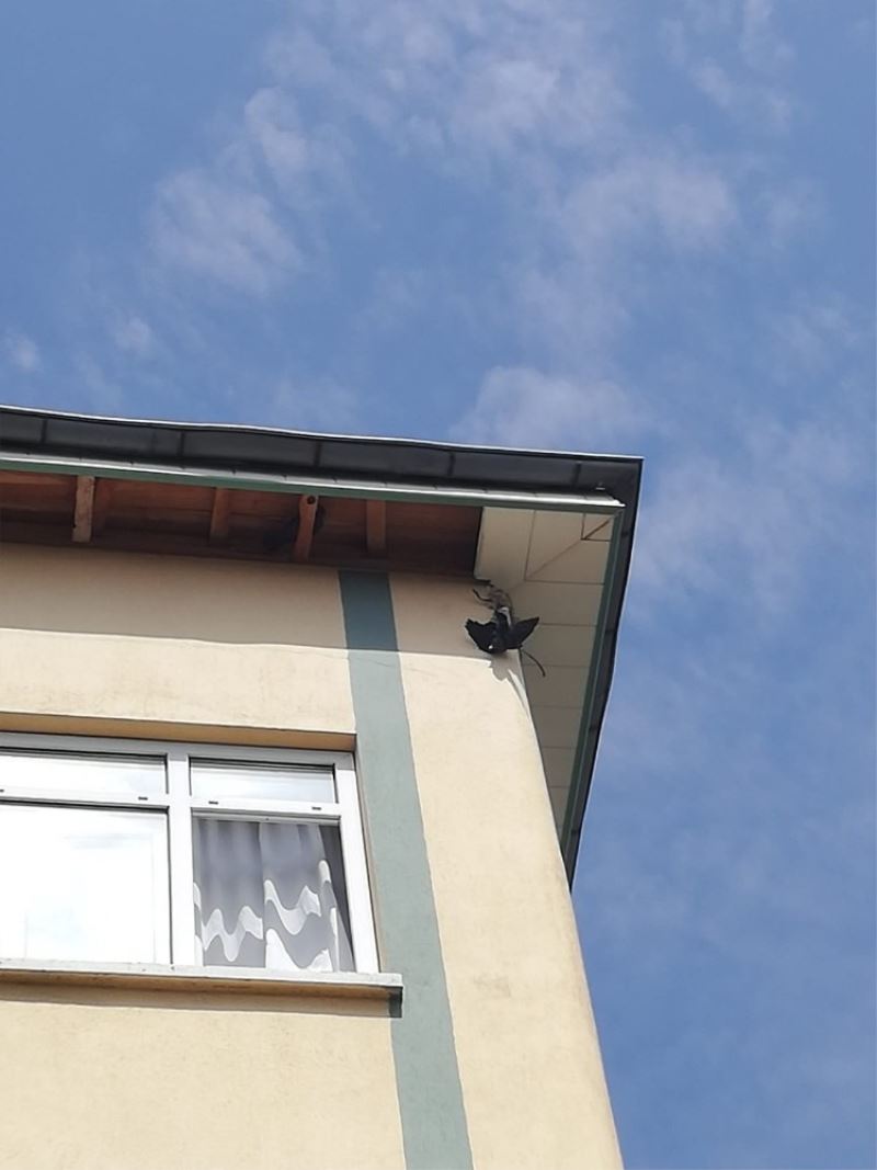 Çatıda mahsur kalan kargayı itfaiye ekipleri kurtardı