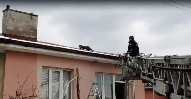 Çatıda mahsur kalan kedi itfaiye ekiplerince kurtardı