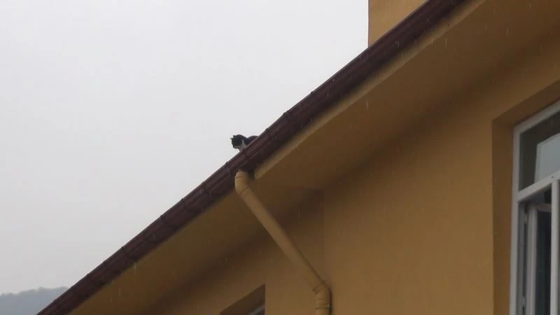 Çatıda mahsur kalan kedi, itfaiye ekiplerini görünce kendisi aşağı indi