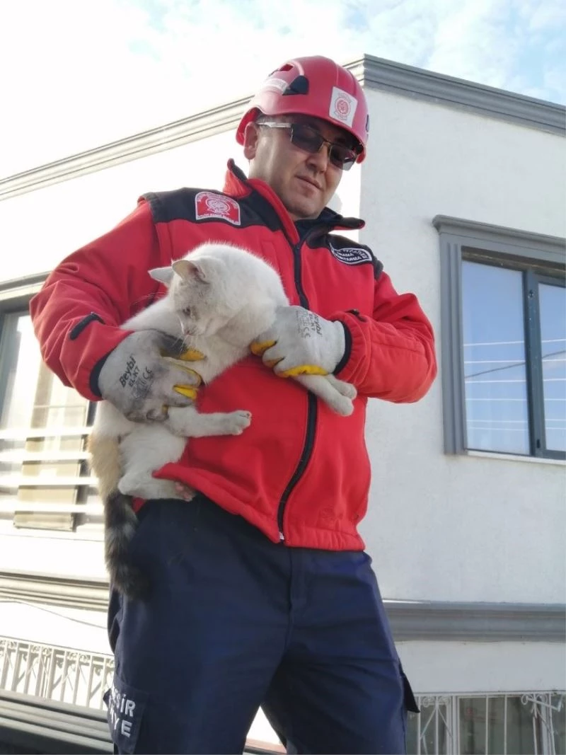 Burhaniye ilçesinde, bir binanın çatısında mahsur kalan kediyi itfaiye kurtardı.