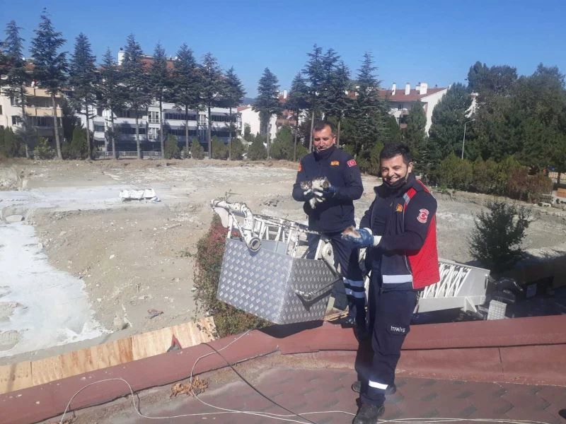 Çatıda mahsur kalan yavru kedileri itfaiye kurtardı
