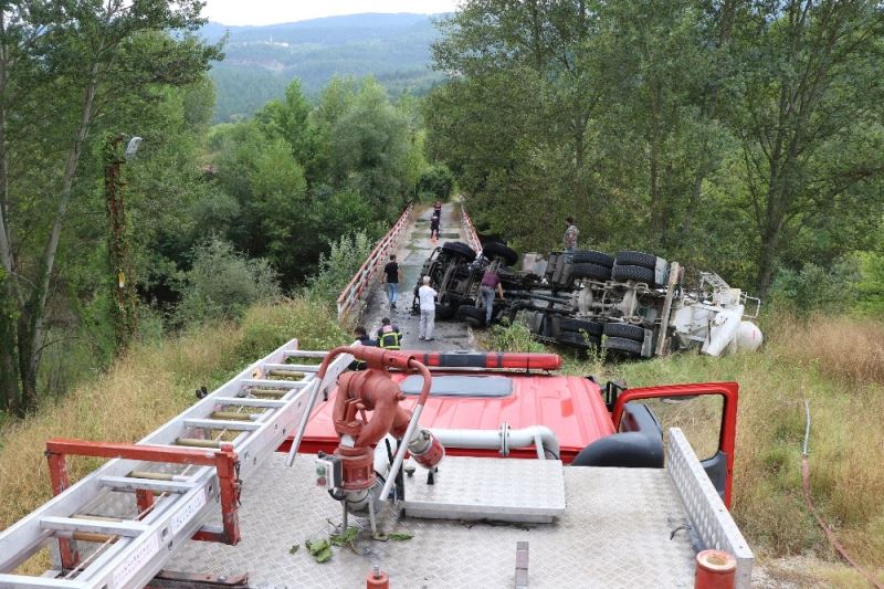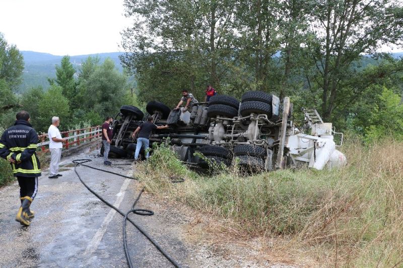 Karabük’ün Safranbolu ilçesinde devrilen ve çaya düşmekten son anda kurtulan beton mikserinde yangın çıktı. Sürücü ise kendisini son anda dışarı atarak kurtuldu.
