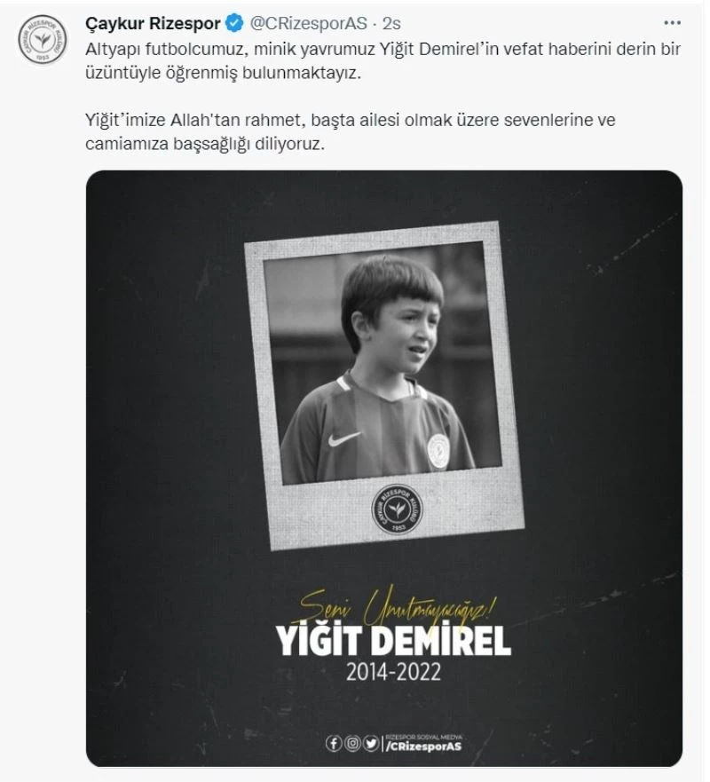Çaykur Rizespor’un 8-10 yaş takımı oyuncusu 8 yaşındaki Yiğit Demirel, 7 Aralık Çarşamba günü saat 16.45 sıralarında Çaykur Rizespor’un alt yapı tesislerinde üzerine kale direğinin üzerine devrilmesi üzerine kaldırıldığı hastanede 3 gündür yoğun bakımda verdiği yaşam mücadelesini kaybetti. Çaykur Rizespor’un Tuzla karşısında oynadığı maça saatler kala hayatını kaybederek tüm Rize’yi yasa boğan Yiğit Demirel’in acı haberini alan kulübe ait sosyal medya hesapları siyah beyaza büründü. Maç öncesi sahaya çıkacağı kadroyu siyah beyaz paylaşan Karadeniz ekibi, maç görsellerini de aynı şekilde siyah beyaz paylaştı. Karşılaşmada ise tribünlerde minik Yiğit’in fotoğrafı açılarak taraftarlar tarafından ‘Yiğit ölmedi kalbimizde yaşıyor’ şeklinde tezahüratlar yapıldı.