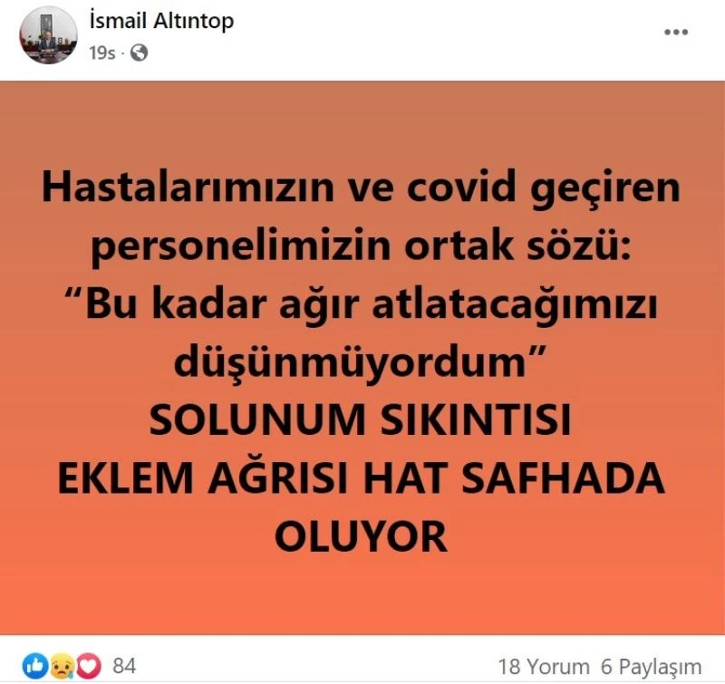 Kayseri Devlet Hastanesi Başhekimi İsmail Altıntop, sosyal medya hesabından "Hastalarımızın ve Covid-19 geçiren personelimizin ortak sözü; ’bu kadar ağır atlatacağımızı düşünmüyorduk’ solunum sıkıntısı ve eklem ağrıları had safhada oluyor" paylaşımında bulundu.