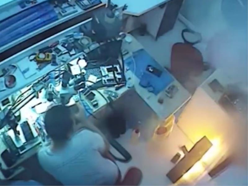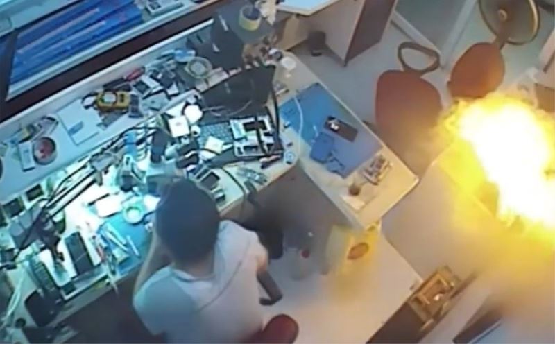 Aydın’da tamir edilmesi için teknik servisine bırakılan cep telefonunun bataryası adeta bomba gibi patladı. Telefona takılı olan bataryanın patlama anı güvenlik kameraları tarafından saniye saniye kaydedildi.