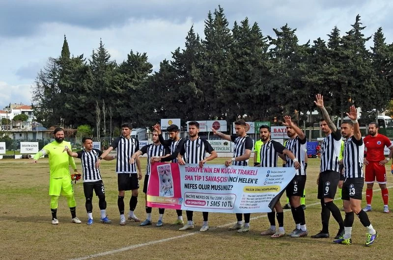 Çeşme Belediyespor maça, "Türkiye’nin en küçük trakeli SMA tip savaşçısı İnci Melek’e nefes olur musunuz?" yazılı pankartla çıktı.