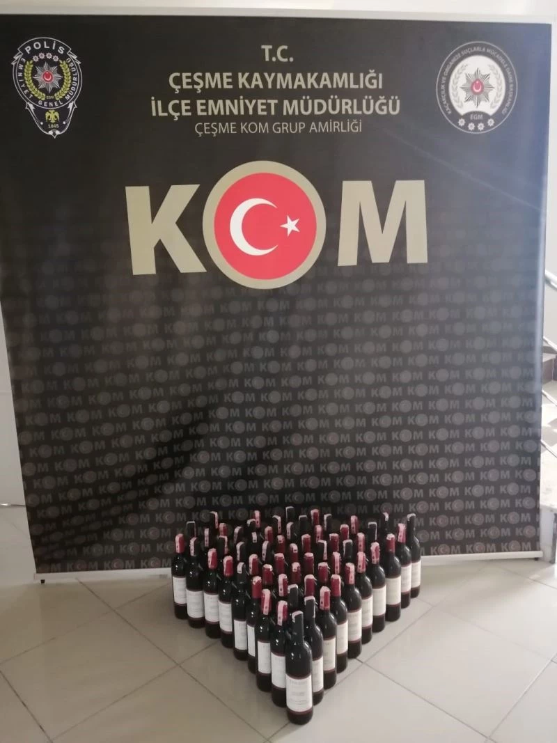 İzmir’in Çeşme ilçesinde Kaçakçılık ve Organize Suçlarla Mücadele (KOM) Grup Amirliği ekipleri gerçekleştirdikleri operasyonda sahte bandrollü 58 şişe kaçak içki ele geçirdi.
