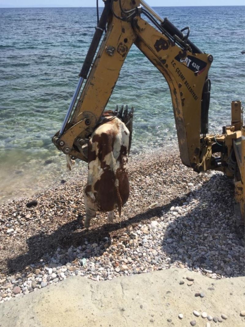 Çeşme Deliklikoy’da kıyıya inek leşi vurdu. Vatandaşların ihbarı üzerine Çeşme Belediyesi Temizlik İşleri Müdürlüğü ekipleri olay yerine gelerek ineği denizden çıkardı.