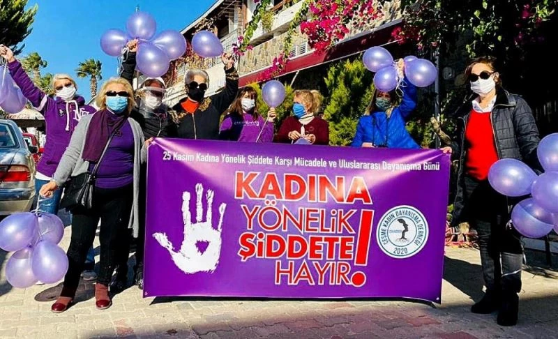 Çeşme Kadın Dayanışma Derneği (ÇEKADER) Başkanı Nermin Ekinci ve dernek üyesi kadınlar 25 Kasım Kadına Yönelik Şiddete Karşı Uluslararası Dayanışma ve Mücadele Günü nedeniyle gökyüzüne mor balonlar saldı.