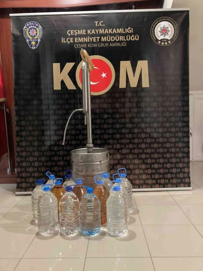 Edinilen bilgiye göre, Çeşme İlçe Emniyet Müdürlüğü Kaçakçılık ve Organize Suçlarla Mücadele (KOM) Grup Amirliği ekipleri, Reisdere Mahallesi’nde sahte alkol ticareti yaptığı iddia edilen H.Ö. adlı şahsın ikametine baskın yaptı. KOM ekiplerinin yaptığı aramada, 10 adet 5 litrelik plastik su şişeleri içerisinde toplam 50 litre rakı, 3 adet 5 litrelik plastik şişe içerisinde 15 litre viski ve 1 adet alkol damıtma ünitesi ele geçirildi. Ele geçirilen sahte içkiler ve damıtma ünitesi muhafaza altına alınırken, olayla ilgili soruşturma başlatıldı.
