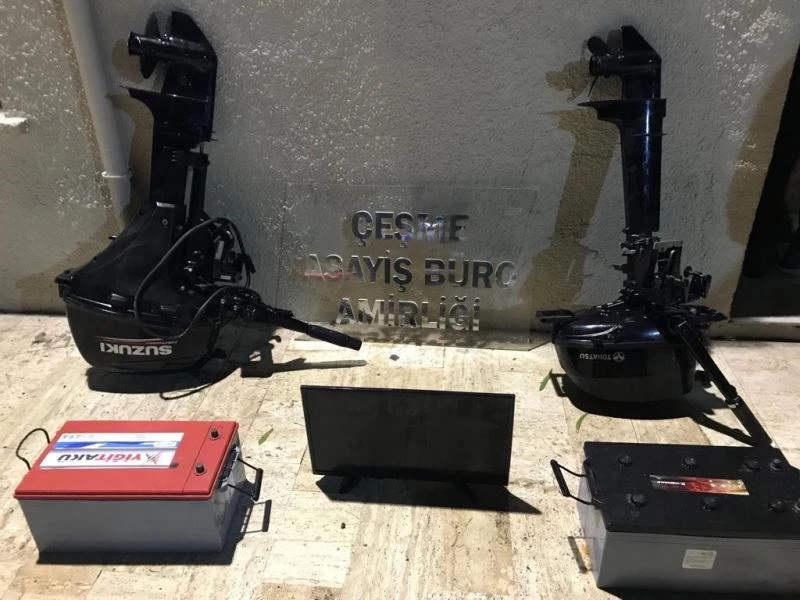Edinilen bilgiye göre, Çeşme ilçesi Yıldızburnu’nda bağlı olan teknelerden; iki adet tekne motoru, iki akü ve bir televizyon çalındı. Çeşme İlçe Emniyet Müdürlüğü Asayiş Büro Amirliği ekipleri, hırsızlık olayı üzerine çalışma başlatırken, hakkında çok sayıda suç kaydı bulunan İ.B.’yi yakaladı. Şüpheliyi sorgulayan ekipler, aldıkları bilgi üzerine çok sayıda suç kayıtları bulunan A.B. ve B.K.’yı da gözaltına aldı. İki kişi, İzmir’in Konak ilçesinde çaldıkları malzemelerle birlikte yakalandı. Gözaltına alınan iki kişi, emniyete götürüldü.