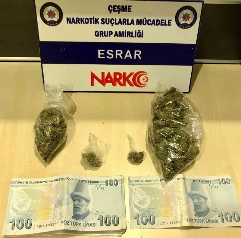Edinilen bilgiye göre, Çeşme Narkotik Suçlarla Mücadele (NARKO) Grup Amirliği ekipleri, iddialara göre kiraladığı araçla İzmir’e giderek uyuşturucu madde alan ve aldığı uyuşturucu maddeyi Çeşme’deki iş yerine girerek saklayan Ş.P’yi takibe aldı. NARKO ekipleri, Ş.P.’nin kiraladığı araç içerisinde 100 lira karşılığında B.D.’ye uyuşturucu madde sattığını tespit etti. B.D.’yi 0,75 gram uyuşturucu maddeyi iş yerinin tuvaletinden alırken suçüstü yakalayan NARKO ekipleri, uyuşturucuyu sattığı iddiasıyla ŞP’nin üzerinde, kiraladığı aracında ve konakladığı otel odasında arama yaptı. Ekiplerin yaptığı arama sonucunda, ayrı ayrı torbalar içerisinde 25,65 gram, 15 gram ve 1,35 gram esrar maddesi, satışta elde edildiği değerlendirilen 100 lira ile 3 bin 250 lira ele geçirdi. İki şüpheli hakkında yasal işlem başlatıldı.