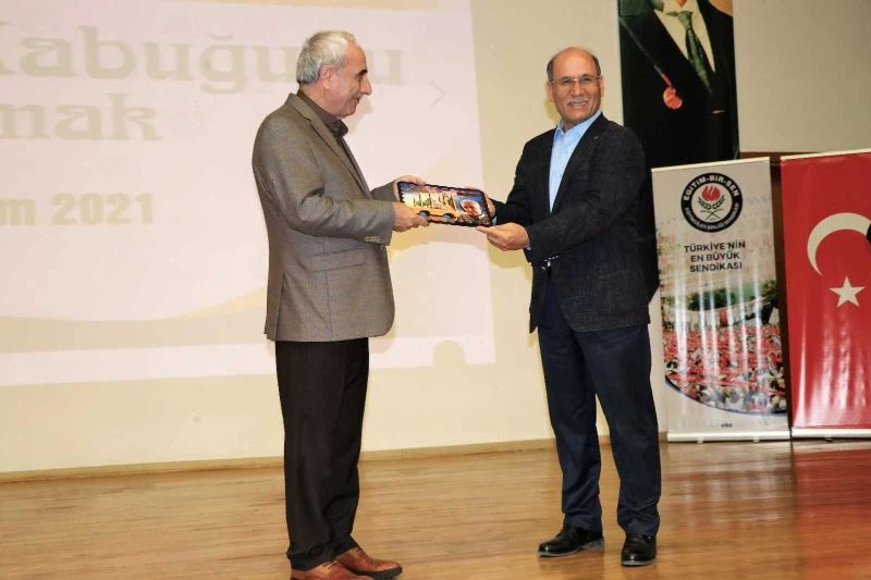 Programın son bölümünde Eğitim-Bir-Sen Adana Şube Başkanı Mehmet Sezer Prof. Dr. Nurullah Genç’e hediye takdiminde bulundu.