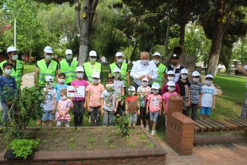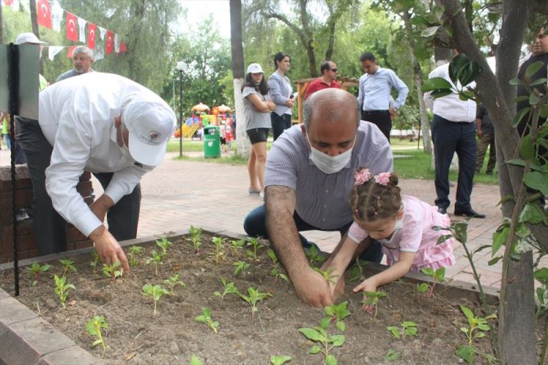 Konusmalarin ardindan etkinlige katilan çocuklar aileleriyle birlikte parkta çiçek dikerek suladilar.