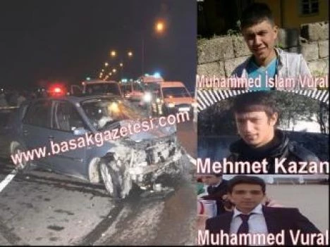 OSMANİYE- Osmaniye?de üç aracın karıştığı trafik kazasında 3 kuzen öldü, biri ağır 3 kiş de yaralndı. Kaza gece saat 12.10 sularında Güney Çevre Yolu Başmahalle giriş kavşağında meydana geldi. Çevre yolundan Musa Şahin Bulvarına seyir halinde olan Muhammet Vural (24) idaresindeki 80 EG 954 Plakalı otomobil, iddiaya göre aşırı hız ve dikkatsilik sonucu Karaboyunlu Mahallesi istikametinden Çevre yoluna çıkmak isteyen Muhittin Bayraktar (56) kontrolündeki 80 DF 307 Plakalı otomobil ile ardında takla atarak karşı gönden gelmekte olan Celal Tekinalp (26) idaresindeki 80 EG 837 Plakalı otomobile çarparak şarampole düştü. Kaza sonrası bölgeye çok sayıda 112 Acil Servis Ambulansı, Kaza Kurtarma Ekibi, İtfaiye ve Polis sevk edildi. Araçlarsa sıkışan bazı yaralılar Belediye Arama Kurtarma Ekiplerinin çalışması sonucu çıkartıldı. Osmaniye Devlet ve Özel Yeni Hayat Hastanelerine kaldırılarak tedavi altına alınan yaralılardan Yusuf Düldül (23), İslam Vural (19) ve Mehmet Kazan (21) yapılan tüm müdahalelere rağmen kurtarılamadı. Sürücülerden Muhammet Vural?ın yoğum bakım servisinde tedavisinin sürdüğü, Celal Tekinalp ve Muhittin Bayraktar?ın ise sağlık durumlarının iyi olduğu öğrenildi. Kaza ile ilgili soruşturma sürüyor.Haber: İbrahim EMÜL/OSMANİYE