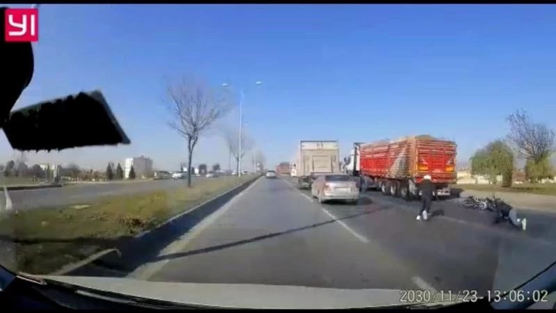 Eskişehir’de, seyir halinde iken iki kamyonun arasında kontrolünü kaybederek kaza yapan motosikletdeki gençlerin kurtulma anı araç kamerasına yansıdı.