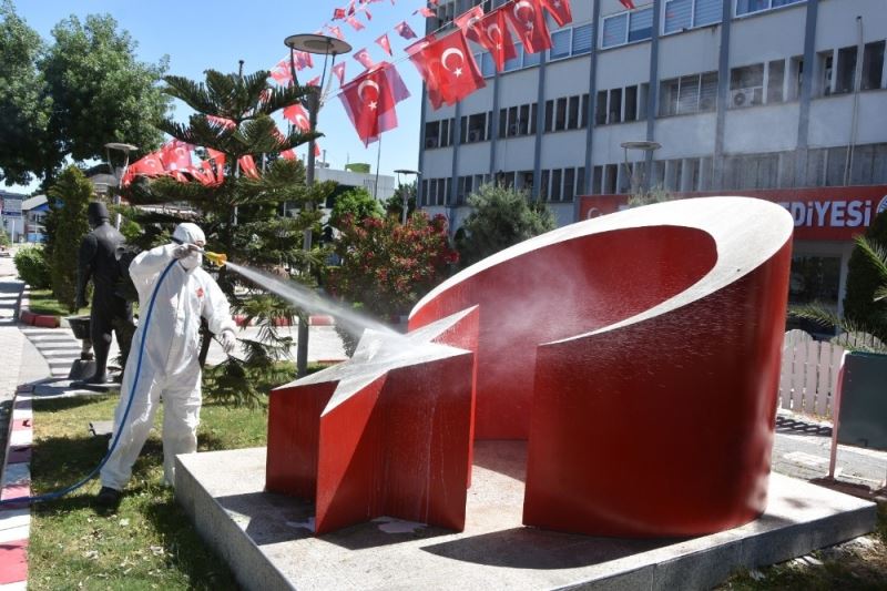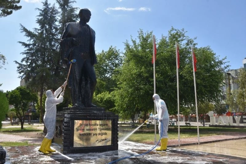 Başkan Hülya Erdem; “ İlçemizde bütün resmi törenler Atamızın bu heykelinin önünde yapılıyor. Ve etrafındaki yeşil alan nedeniyle insan yoğunluğunun olduğu bir lokasyon. Malum bu sıralar korona virüs salgını ile de mücadele ediyoruz. 4 günlük sokağa çıkma yasağını da fırsat bilip ilçemizde güzel bir bayram temizliği yapalım dedik. Aynı şekilde belediyemizin önündeki Ay Yıldız heykelini, Atatürk büstünü ve yine meydandaki Zübeyde Hanım büstünü de köpüklü suyla yıkıyoruz. Bu heykeller bize Atatürk, vatan ve bayrak sevgimizi hatırlatan kıymetli sembollerdir. Onlara tertemiz olmak yaraşır” ifadelerini kullandı.