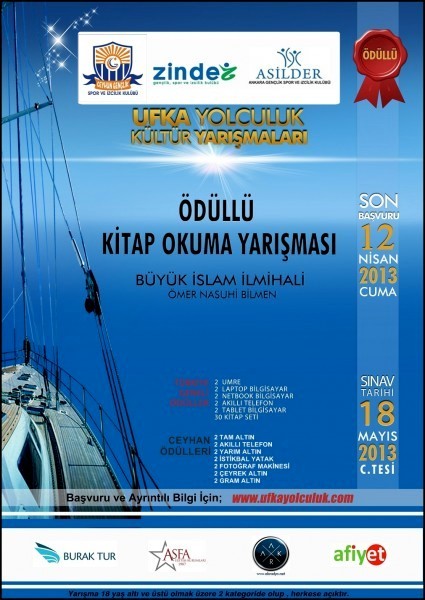 Milli Eğitim Bakanlığı?nın ve Diyanet İşleri Başkanlığı?nın tavsiye ettiği/desteklediği yarışma 18 yaş altı ile 18 yaş üstü olarak iki kategoride gerçekleştirilecek. www.ufkayolculuk.com adresinden başvuru yapılan yarışmaya son başvuru tarihi 12 Nisan 2013 olarak belirlendi. Test usulü yapılacak sınavda yarışmacılar 100 soruyu 120 dakikada cevaplandıracak.