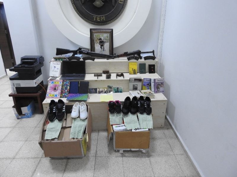A.K.’nin evinde yapılan aramada ise 1 adet uzun namlulu silah, 2 adet ruhsatsız tüfek, Z.T. isimli kadının evinde de 18 farklı spor ayakkabı tabanına özel olarak zulalanmış, örgüt mensuplarına talimatlar içeren ve çıplak gözle okunamayacak şekilde pelür kağıtlara basımı yapılmış 33 adet doküman, çok sayıda örgütsel içerikli kitap ve şüphelilere ait dijital materyaller ele geçirildi.