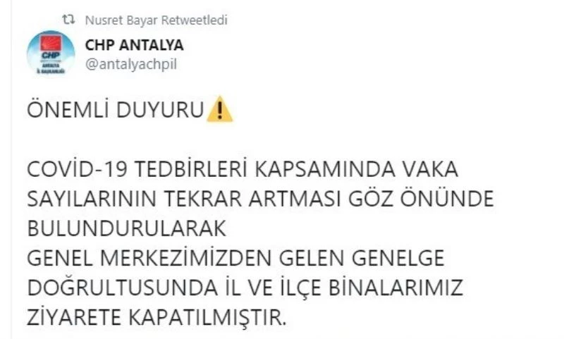 Cumhuriyet Halk Partisi (CHP) genel merkezden gelen genelgeyle ülke genelinde bütün il ve ilçe binalarını ziyarete kapattı. CHP Antalya İl Başkanlığı sosyal medya hesabından, ‘önemli duyuru’ başlığıyla yaptığı açıklamada, Covid-19 tedbirleri kapsamında vaka sayılarının tekrar artmasının göz önünde bulundurulduğunu, genel merkezden gelen genelde doğrultusunda da il ve ilçe binalarının ziyaretçiye kapatıldığını duyurdu.