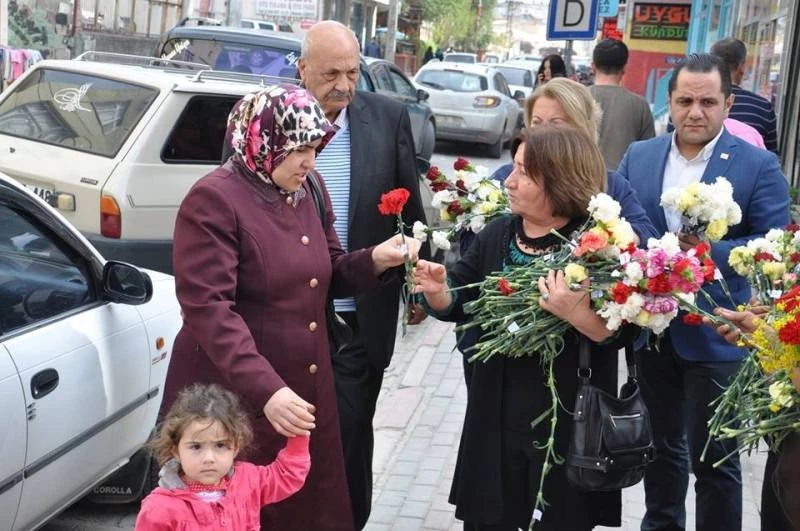 Cumhuriyet Halk Partisi (CHP) Kadirli İlçe Başkanı Mehmet Döğüşcü ve Kadın Kolları Başkanı Fatma Kurt ile Kadın Kolları üyeleri , "8 Mart Dünya Kadınlar Günü" nedeniyle karanfil dağıtılar.