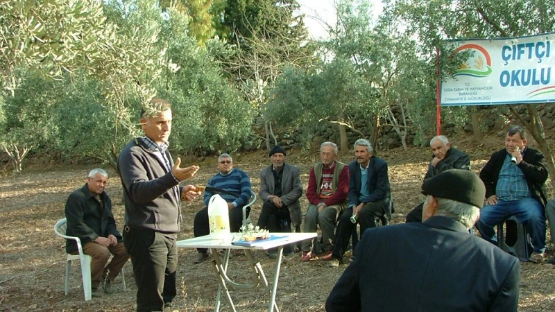 Gıda Tarım ve Hayvancılık Bakanlığı`nın 2014 yılında uygulamaya başlattığı "Çiftçi Tarla Okulu Projesi" kapsamında yürüttüğü eğitim çalışmaları Osmaniye merkez Sakızgediği köyünde devam ediyor. Bir zeytin bahçesinde gerçekleştirilen eğitime 17 üretici katılırken, Eğitimlerde çiftçilere özellikle bitki sağlığı konularında bilgiler verilerek, bahçede o an için mevcut olan hastalık ve zararlılar hakkın ise uygulamalı olarak gösterimlerde bulunuldu. Eğitimlere katılan üreticilere ayrıca zeytin bahçesinde kullanılan bitki koruma ürünlerinin kullanım zamanları, ilaç seçimi, ilaçların kullanıma hazırlanması ve ilaçların kullanılması hakkında bilgiler verildi. Bunun yanında gübreleme ve gübrelerin nasıl kullanılacağı yani hangi gübrenin ne şekilde verileceği ağaç başında tarif edilerek anlatıldı. Eğitim sonrasında ise budamayla ilgili bilgiler de uygulamalı olarak verildi. Çiftçi Tarla Okulu çalışmalarının 2016 yılında da devam edeceği, konuyla ilgili çiftçilerin veya muhtarların taleplerinin ayrıca karşılanacağı belirtildi.