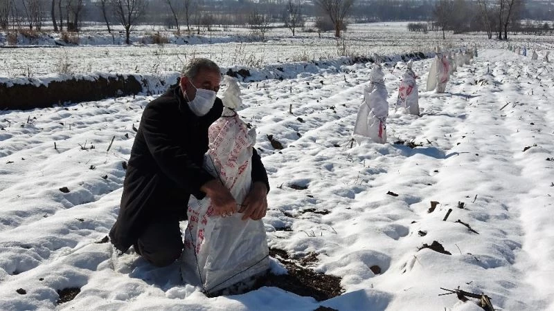 Tokatlı çiftçinin meyve fidanlarını kar ve soğuk havadan korumak amacıyla uyguladığı yöntem dikkat çekiyor.