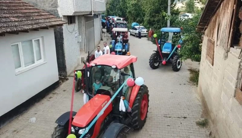 Bursa’nın İnegöl ilçesi kırsal Kulaca mahallesinde ikamet eden çiftçi Mustafa Kamar’ın oğlu İsmail Efe Kamar(7) için düzenlediği traktörlerden oluşan sünnet konvoyu dikkat çekti.