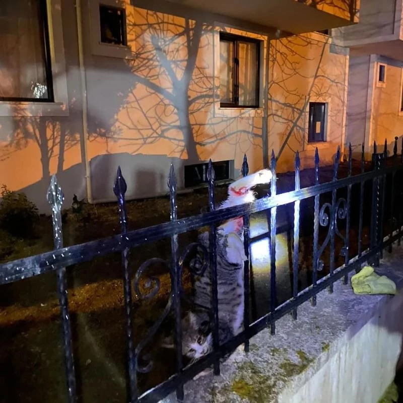 Yalova’nın Çiftlikköy ilçesinde bahçe korkuluklarına patisi sıkışan kedi itfaiye ekiplerinin çalışmasıyla kurtarıldı.