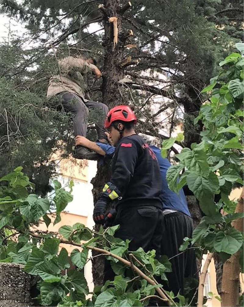 İtfaiye erleri fenalaşan adamı merdiven yardımıyla çıktığı ağaçtan indirerek sağlık ekiplerine teslim etti.